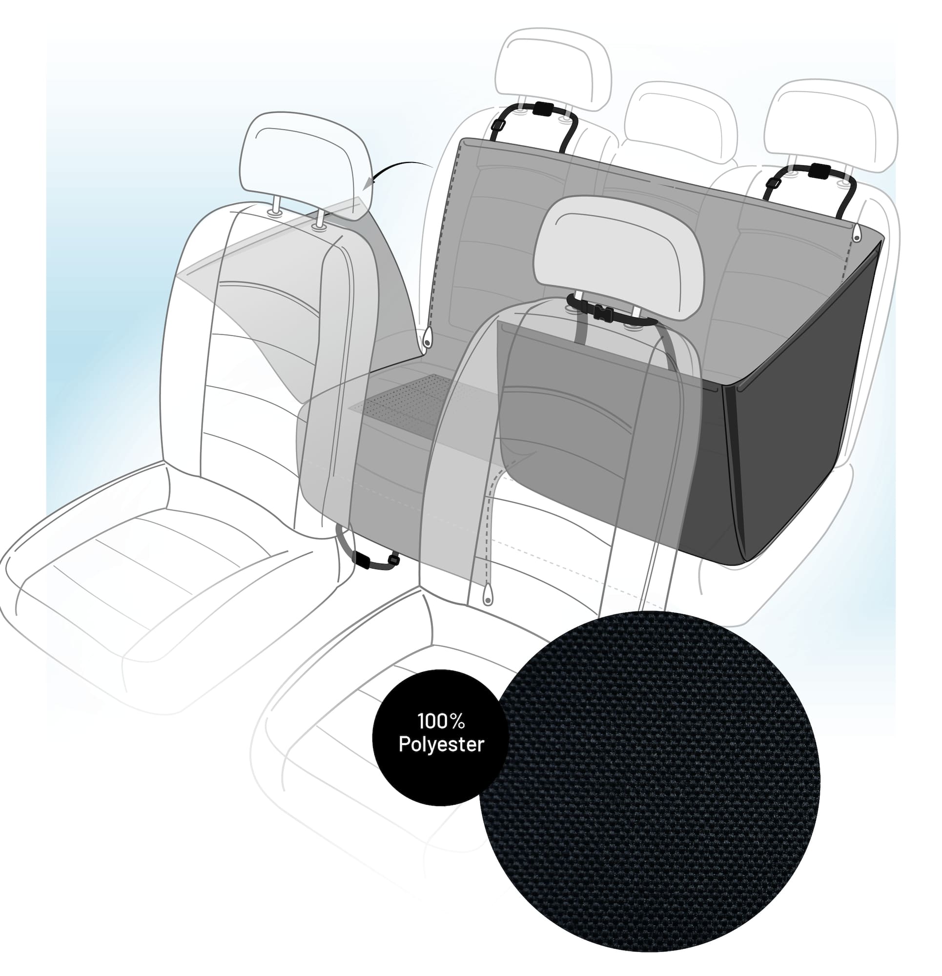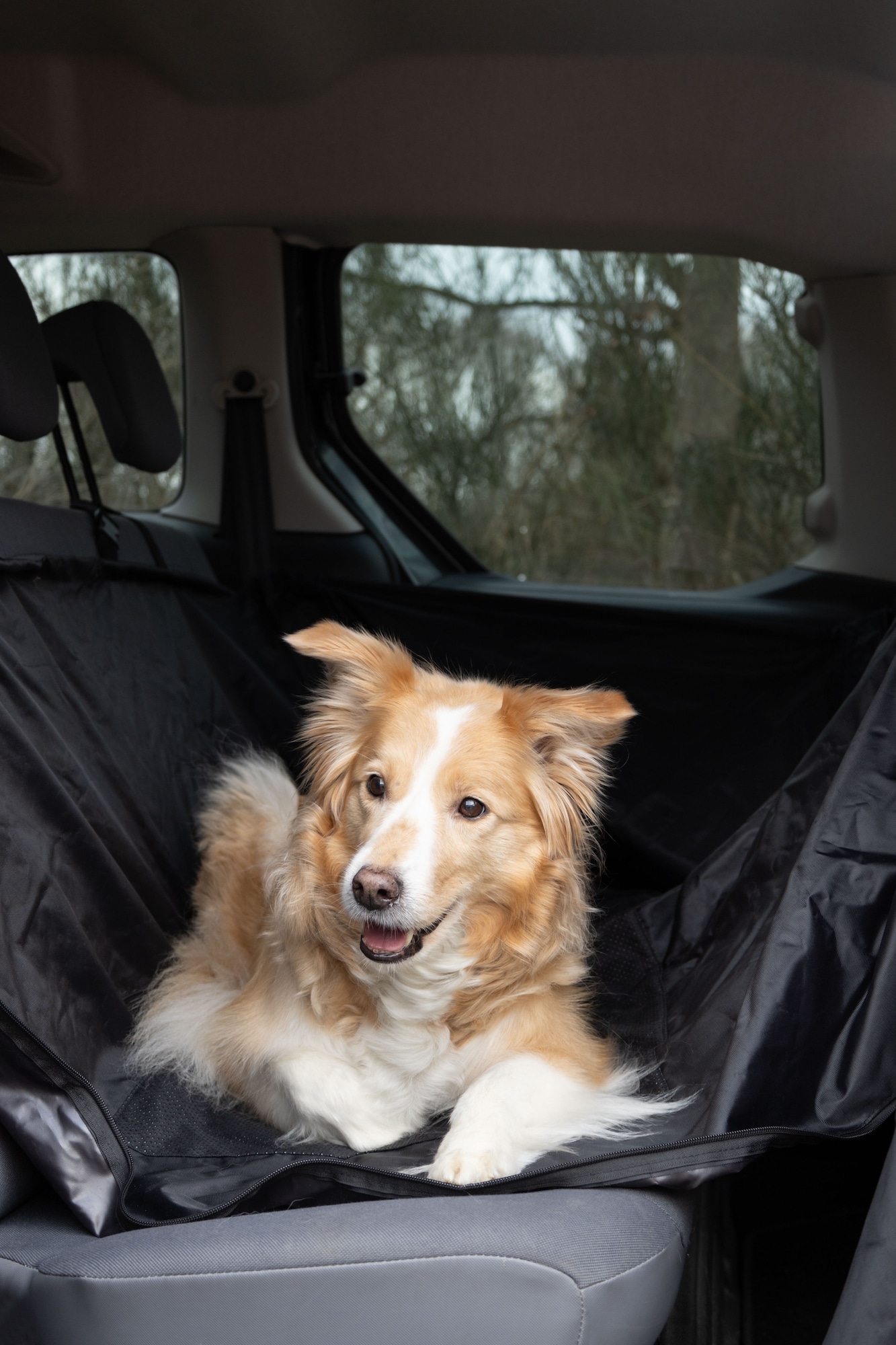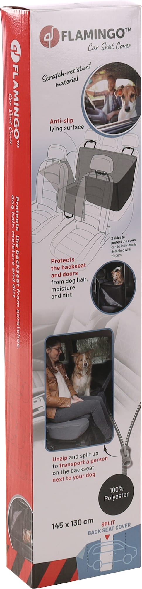 כיסוי מושב אחורי לרכב לכלבים מבית FLAMINGO, עמיד לשריטות ומונע החלקה. מתאים במיוחד לשמירה על הרכב מפני לכלוך, שיער ורטיבות. הכיסוי מתוכנן בסגנון ערסל ומספק הגנה מקיפה למושבים האחוריים ולדלתות.